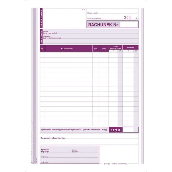 - Znajduje zastosowanie jako uniwersalny druk - rachunek dla zwolnionych podmiotowo z VAT