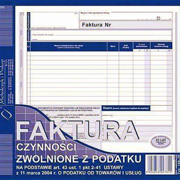 Druk samokopiujący faktura czynności zwolnionych z podatku na podstawie art 43 ust.1 pkt 2-41 ustawy z 11.03.2004r. o podatku VAT