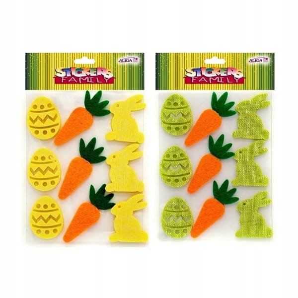 Komplet wielkanocnych naklejek w żółtym kolorze, w którym znajdziemy trzy jajka, trzy marchewki, oraz pasujące do wiosennego klimaty trzy zające/króliki :) Naklejki doskonale sprawdzą się do naklejania na kubki, kartki i inne przedmioty, pozycja obowiązkowa w każdym warsztacie dekoratorskim.