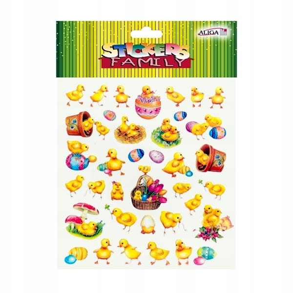 Arkusz kolorowych naklejek z motywem kolorowych kurczaczków.