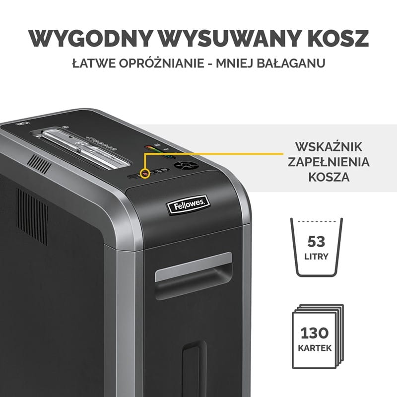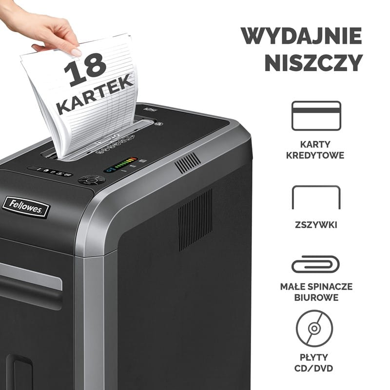 - Niszczy dokumenty ze zszywkami, małymi spinaczami, karty kredytowe, płyty CD/DVD