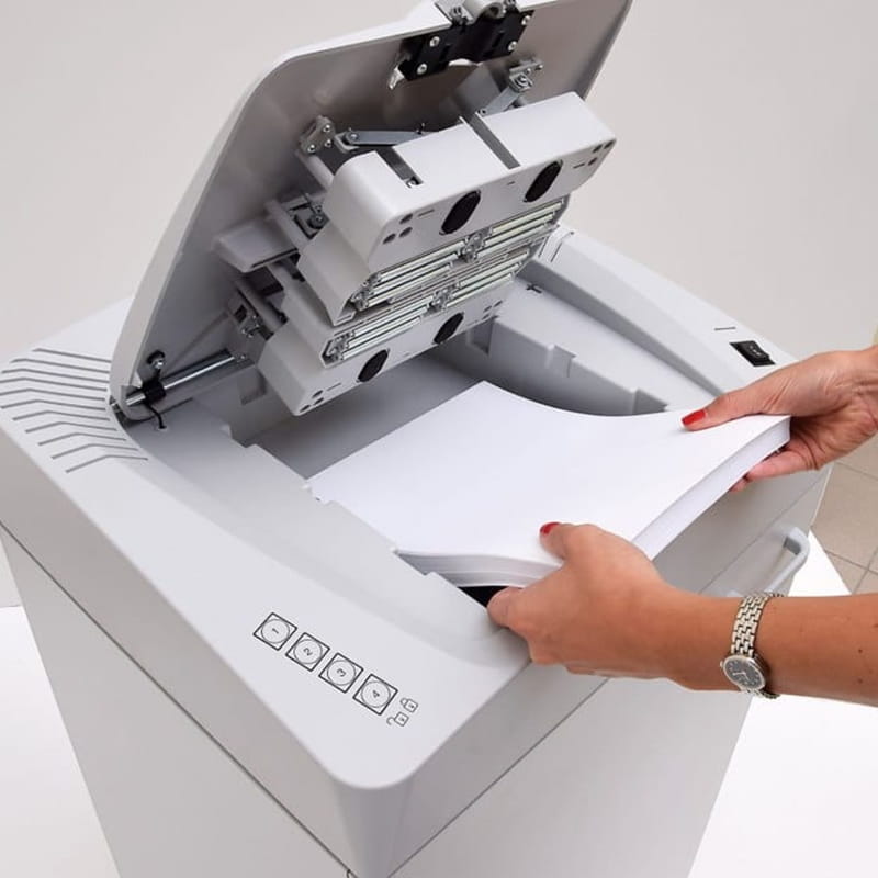 - Prędkość 30 arkuszy na minutę pozwala na szybkie rozdrabnianie dużych ilości kartek papieru.