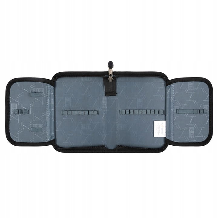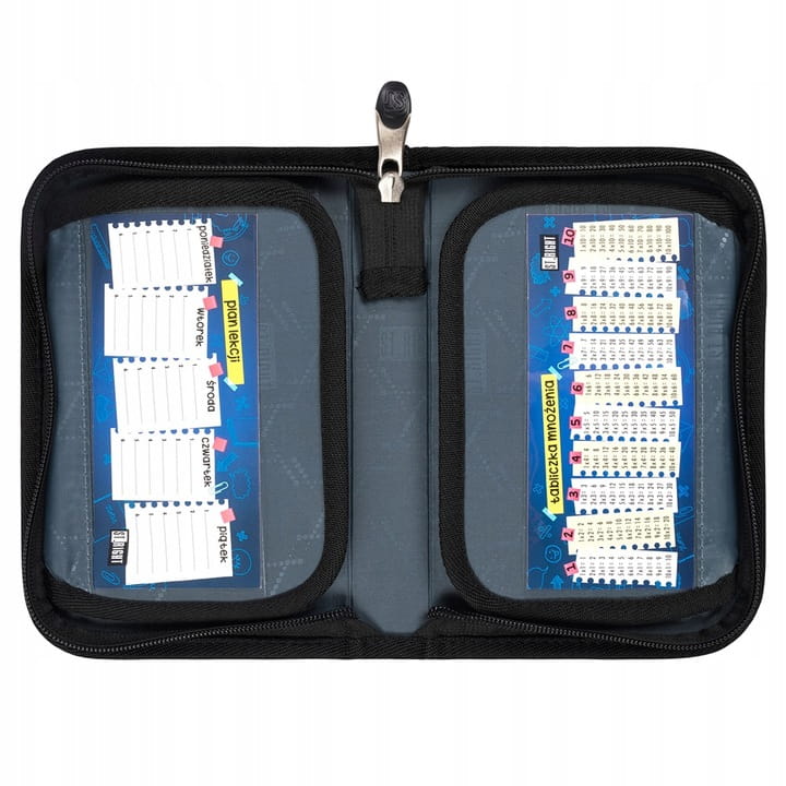 Piórnik pojedynczy z dwiema klapkami, zamykany za pomocą zamka błyskawicznego. Posiada przegrody i liczne mocowania ułatwiające organizację przyborów szkolnych.