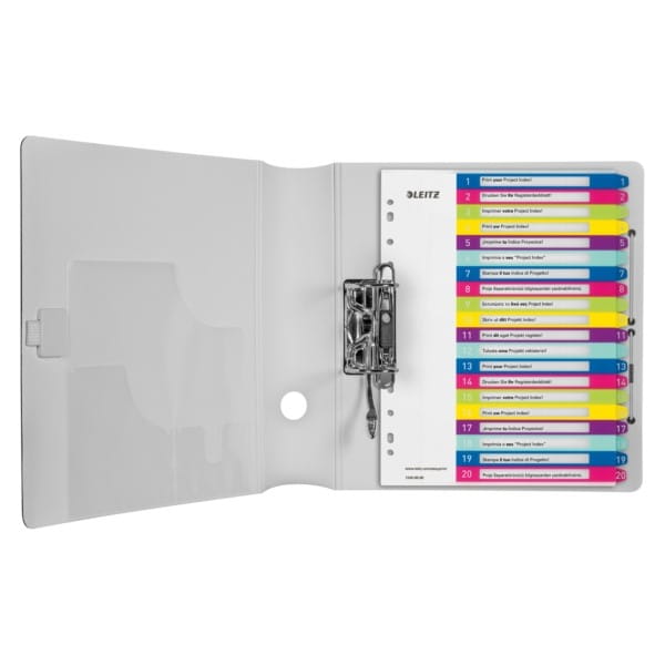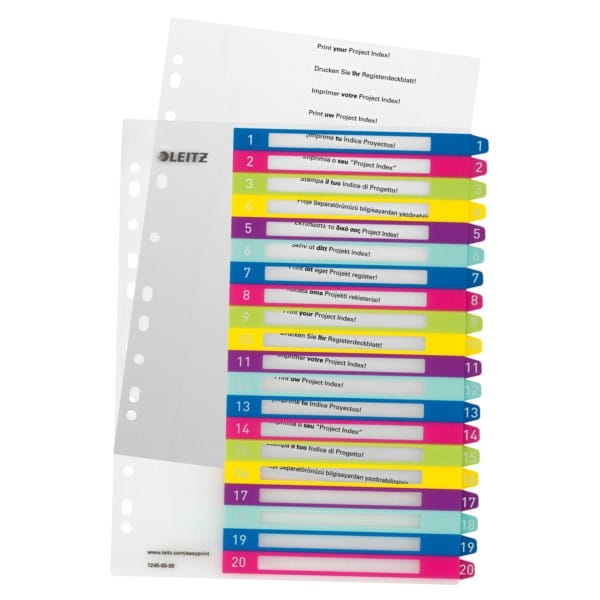 Format A4+ pozwala na szybki dostęp do dokumentoacute;w, nawet w przypadku przechowywania ich w koszulkach 20 zadrukowanych numerycznie przekładek (1-20) do łatwego sortowania 11 uniwersalnych otworoacute;w umożliwiających wpinanie do segragatora