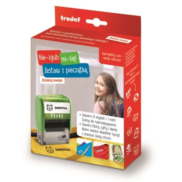 Pieczątka do znakowania ubrań TRODAT NIE-ZGUB MI-SIĘ wraz z drukarenką