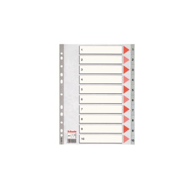 Wzmocniony perforowany pasek na karcie opisowo-informacyjnej 10 zadrukowanych numerycznie indeksów (1-10) pomocnych w szybkim dostępie do dokumentów 11 uniwersalnych otworów umożliwiających wpinanie do segragatora Grubość folii PP 0,12 mm Kod 100105 Kolor Szary Wymiary 225 x 2 x 297 Format A4 Rodzaj indeksu 1-10 Waga 0,07"
