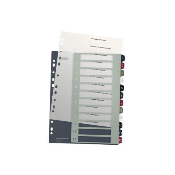 Format A4+ pozwala na szybki dostęp do dokumentoacute;w, nawet w przypadku przechowywania ich w koszulkach 12 zadrukowanych numerycznie przekładek (1-12) do łatwego sortowania 11 uniwersalnych otworoacute;w umożliwiających wpinanie do segragatora