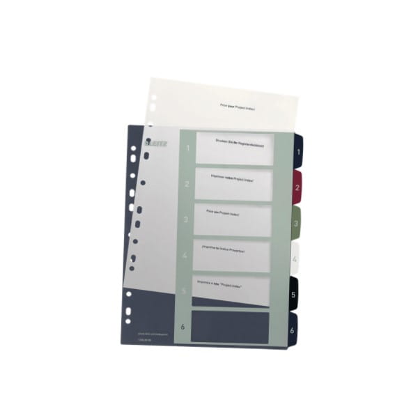 Przekładki do wielokrotnego użytku, bardzo wytrzymałe, w wyrafinowanej kolorystyce. Z kartą do indywidualnego zadruku na komputerze. Możliwość wydruku spisu treści z komputera za pośrednictwem formularza umieszczonego na stronie: www.leitz.com/easyprint Mocny, przezroczysty PP o grubości 0,3 mm Format A4+ pozwala na szybki dostęp do dokumentów, nawet w przypadku przechowywania ich w koszulkach 6 zadrukowanych numerycznie przekładek (1-6) do łatwego sortowania 11 uniwersalnych otworów umożliwiających wpinanie do segragatora Materiał Polypropylen (PP) Wymiary 245 x 305 x 2 Format A4 Maxi 1-6 Waga 0,15"