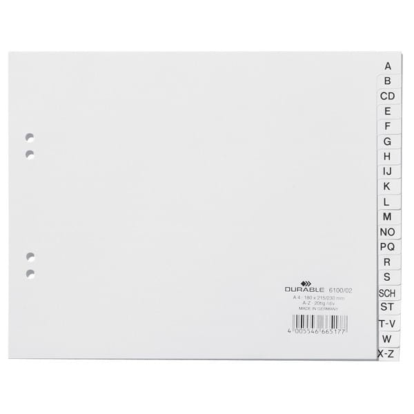 Przekładki A4 wykonane z PP nadrukowane indeksy A-Z białe 20 części/610002/