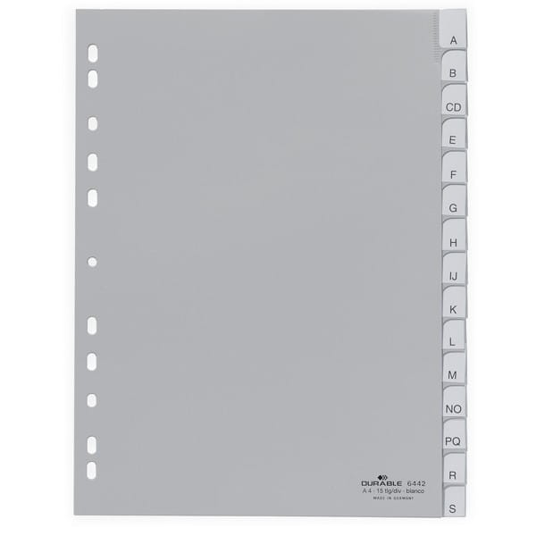 Przekładki A4 wykonane z PP zgrzane wymienne indeksy 0-15 A-Z szare /644210/