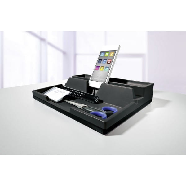 Przybornik Varicolor Smart Office to kompaktowy przybornik utrzymany w nowoczesnej estetyce. Idealnie pasuje do innych produktów z serii VARICOLOR, z łatwością zmieścisz go w pojemniku z szufladami. Na biurku prezentuje się niezwykle stylowo, a jego funkcjonalność zaskakuje. Poza dwoma przegrodami na przybory biurowe posiada miejsce przeznaczone na smartfon lub tablet. Kabel od ładowarki bez problemu schowasz w dedykowanym otworze. Przybornik wykonany jest z najwyższej jakości tworzywa sztucznego i posiada specjalną, gumową podkładkę, dzięki czemu nie przesuwa się i nie rysuje powierzchni biurka.