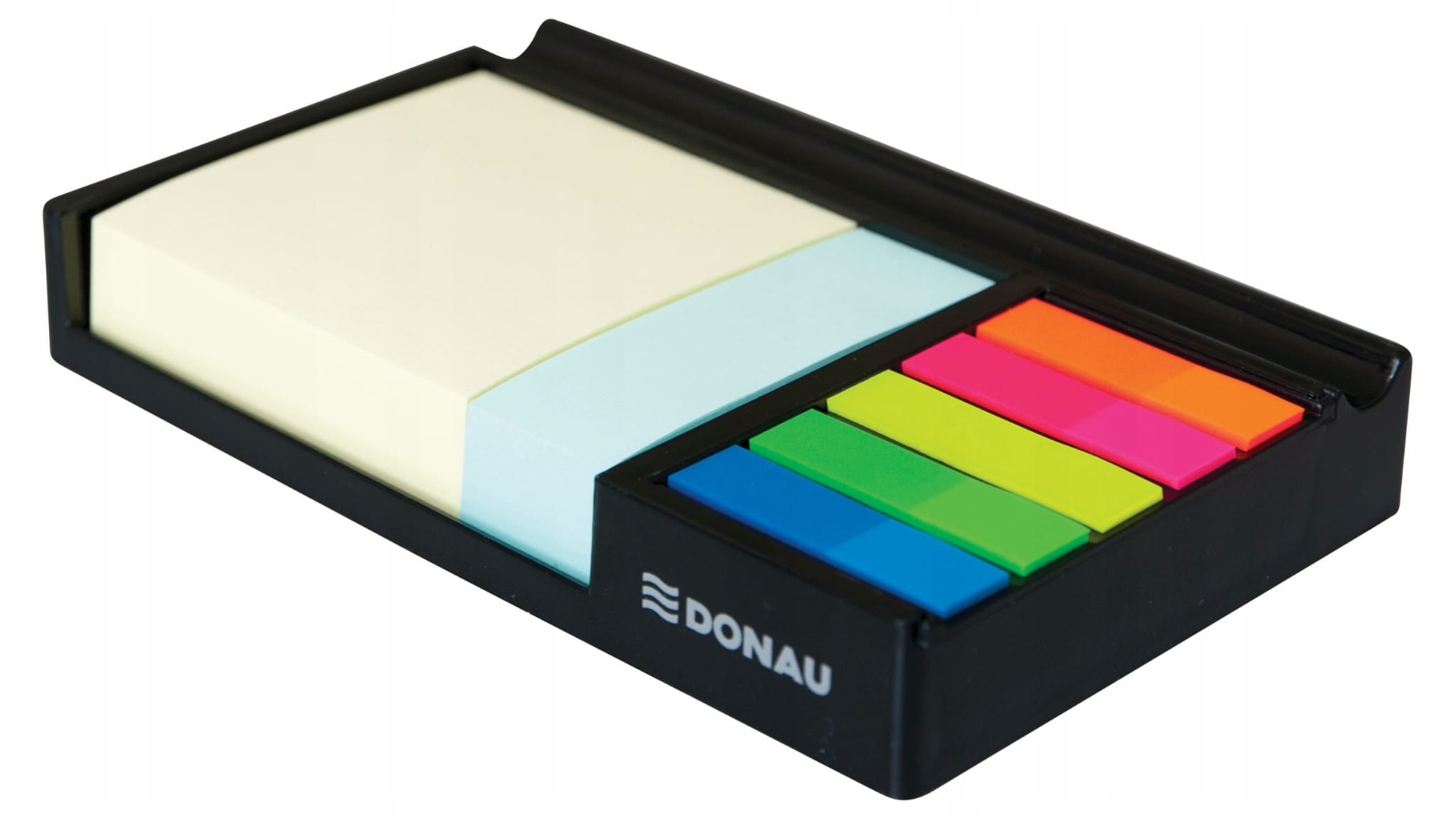 - szuflady z pastelowo-żółtym bloczkiem samoprzylepnym o wymiarach 76x76 (200k) oraz pastelowo-niebieskimi samoprzylepnymi zakładami papierowymi o wymiarach 76x25mm (200k).