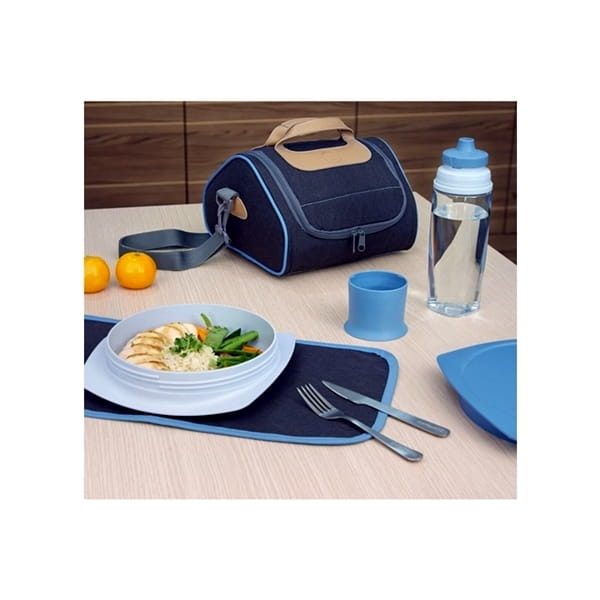 Mieści obiad, sztućce, butelkę z wodą, a dodatkowo higieniczną podkładkę na stół stanowiącą dodatek do torby