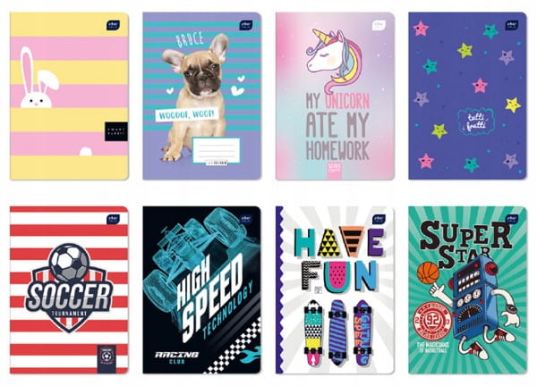 Zeszyty w intensywnych kolorystycznie grafikach, zaprojektowane zgodnie z aktualnymi trendami w designie i modzie tak, aby sprostać wysokim oczekiwaniom każdego ucznia.